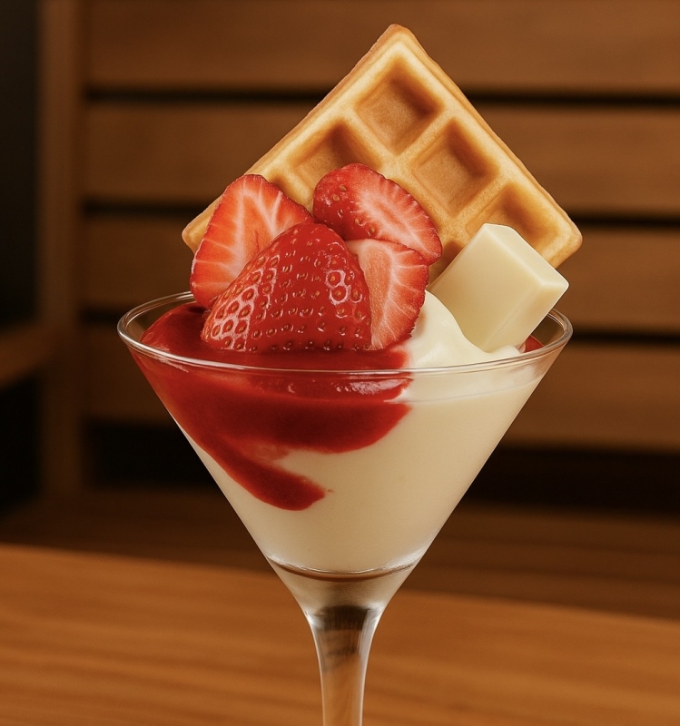 Taça com sorvete, geleia de morango artesanal, morangos frescos e marshmellow e quadradinho de waffle