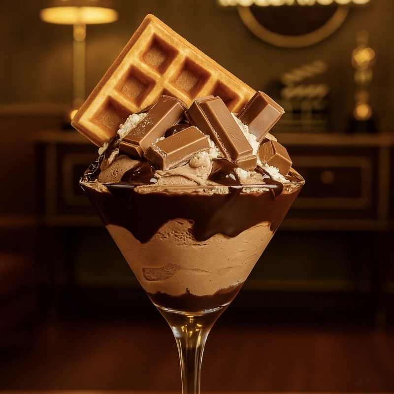 Taça com sorvete, calda de chocolate, chocolate Kitkat e leite Ninho e quadradinho de waffle