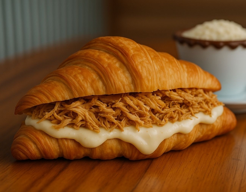 Folhado dourado, recheado com frango desfiado e requeijão cremoso, combinação irresistível
