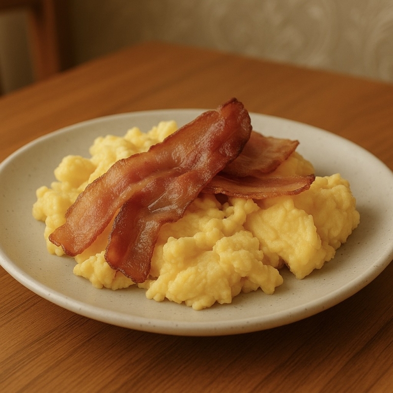 Quatro deliciosos ovos mexidos feito na manteiga no estilo americano, acompanhado de tiras de bacon.
