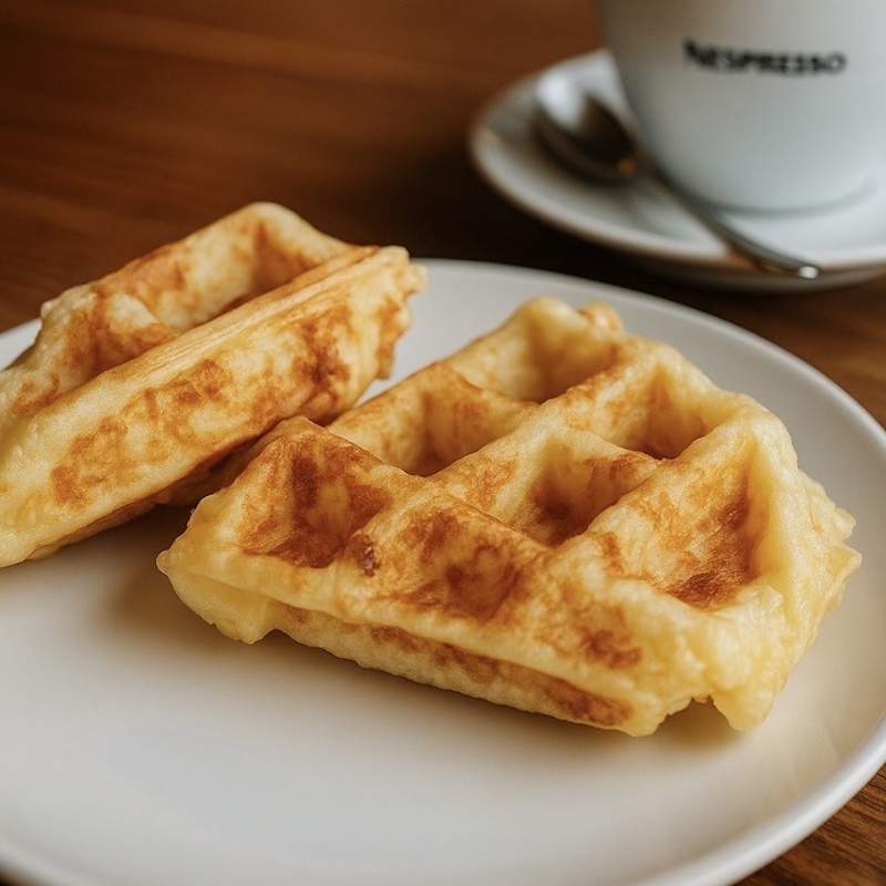 2 quadradinhos de pão de queijo com parmesão em formato de waffle. Feito na hora!