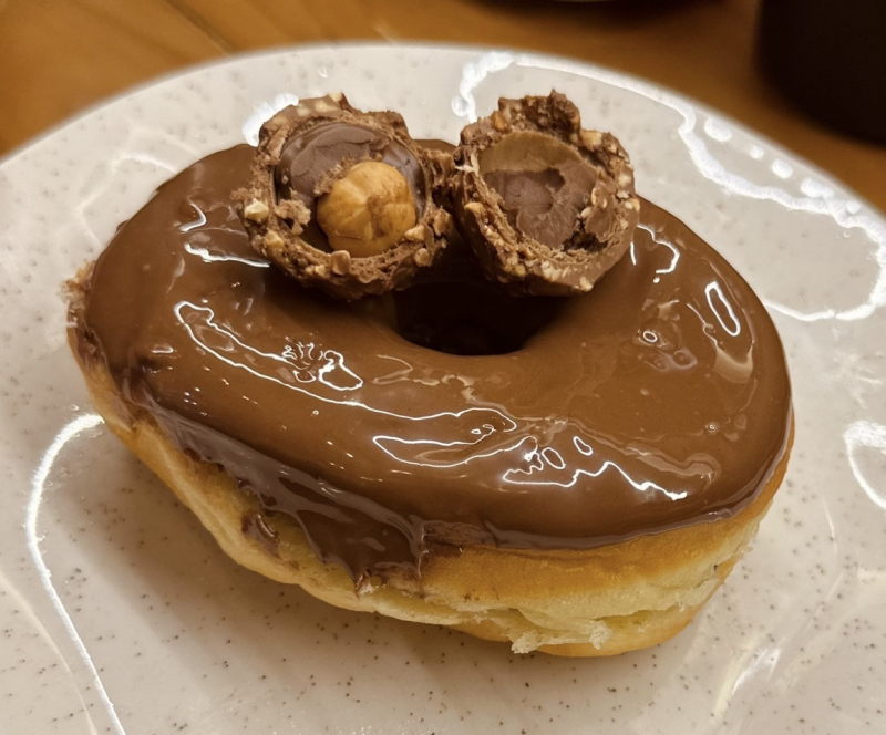 O bombom mais charmoso, Ferrero Rocher, é a estrela deste delicioso donut, com recheio de Nutella e cobertura de chocolate.