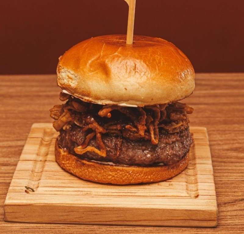 Pão de brioche, costela defumada com barbacue, cebola crispy, maionese, bife artesanal 150g e molho barbacue.