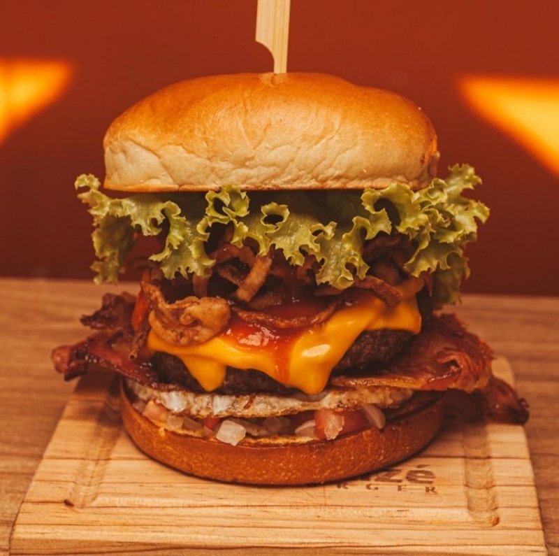 Pão de brioche, bife artesanal 150g, alface, vinagrete, cheddar, ovo, bacon, molho picante e crispy de cebola.