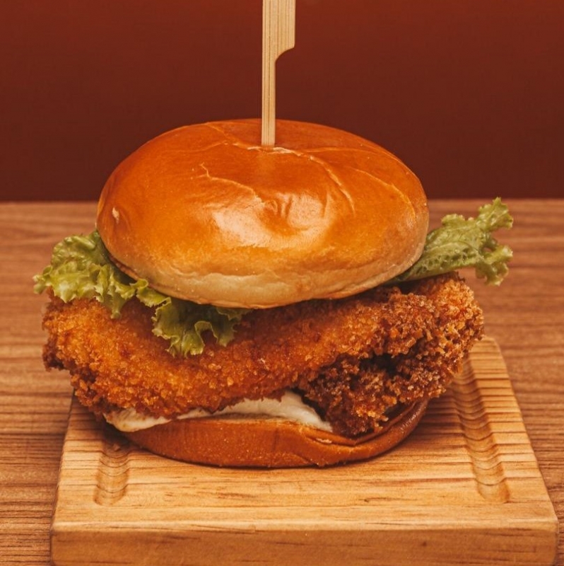 Pão de brioche, filé de frango empanado, cream cheese, molho americano, alface.