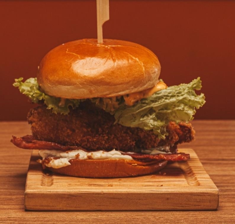 Pão de brioche, filé de frango empanado, bacon, alface, cream cheese, molho americano.