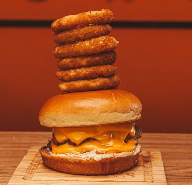 Pão de brioche, 2 bifes artesanais 75g, maionese de chimichurri, anéis de cebola, cheddar.