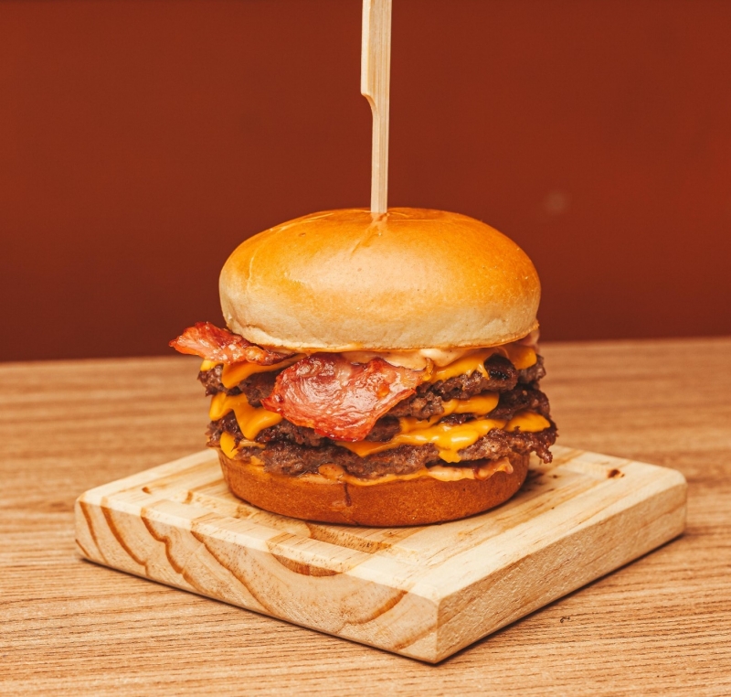 Pão de brioche, 3 bifes artesanal 75g, molho especial, 6 fatias de cheddar bacon.