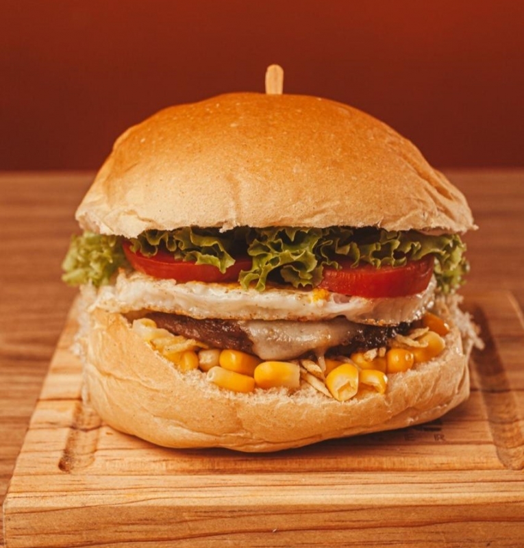 Pão, bife, muçarela, ovo, alface, tomate, milho e batata palha.