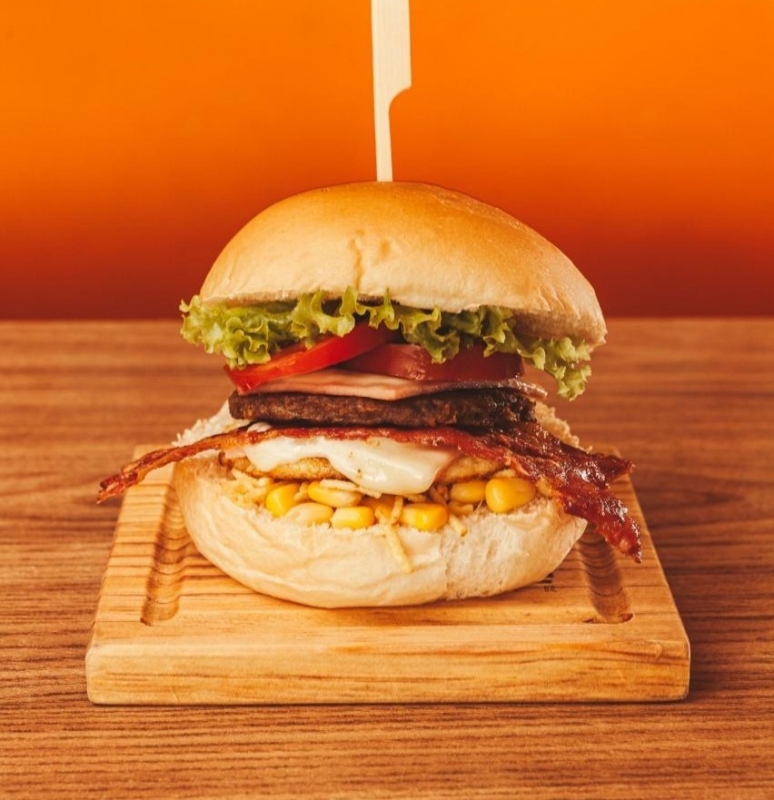 Pão, bife, muçarela, ovo, bacon, presunto, alface, tomate, milho e batata palha.