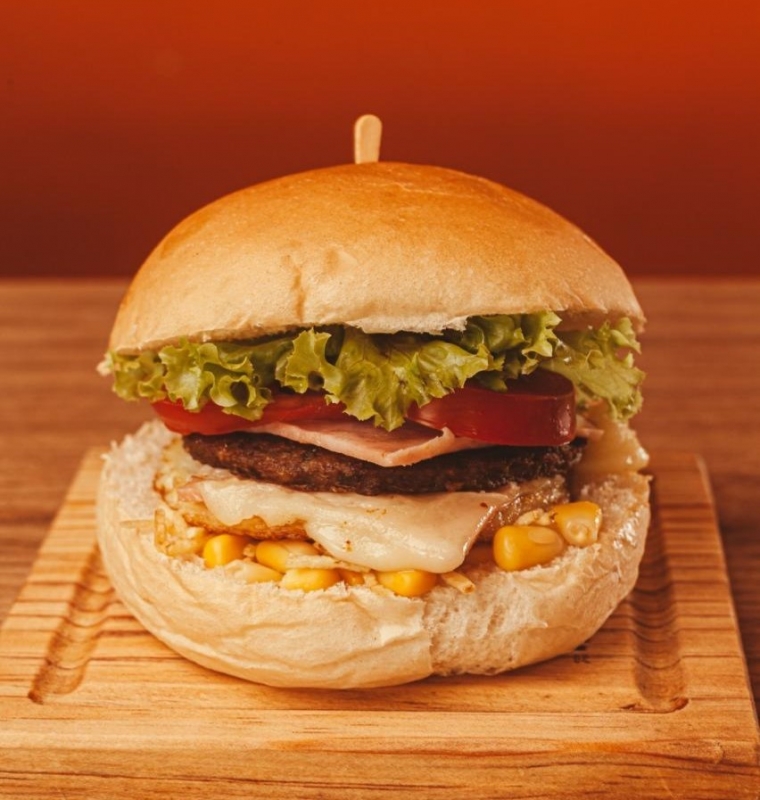 Pão, bife, muçarela, ovo, presunto, alface, tomate, milho e batata palha.