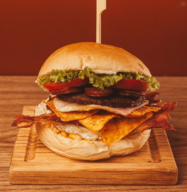 Pão, bife, ovo, muçarela, presunto, bacon, calabresa, alface, tomate, milho e Doritos.