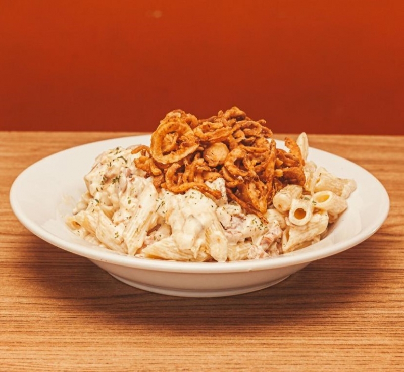 Macarrão penne, peito de frango, calabresa, bacon, cebola, cream cheese, creme de leite e cebola crispy.