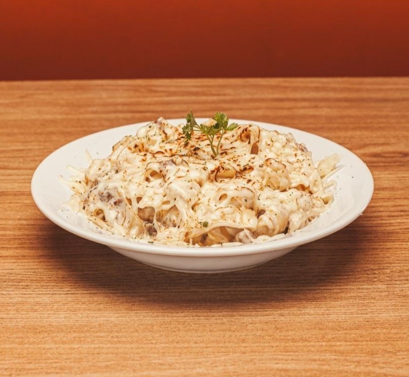 Macarrão fettuccine, cebola, carne bovina, cream cheese, creme de leite e muçarela ralada.
