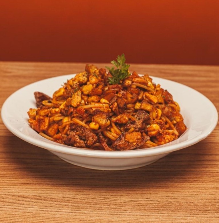 Macarrão espaguete, milho, peito de frango, bacon, carne bovina, molho de tomate, banana frita e cebola.