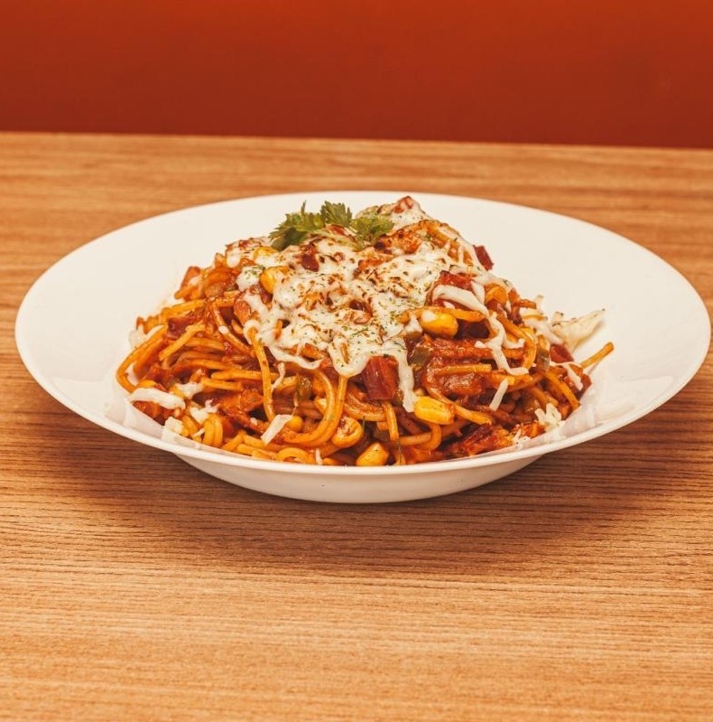 Macarrão espaguete, bacon, calabresa, muçarela, molho de tomate, milho e cebola.