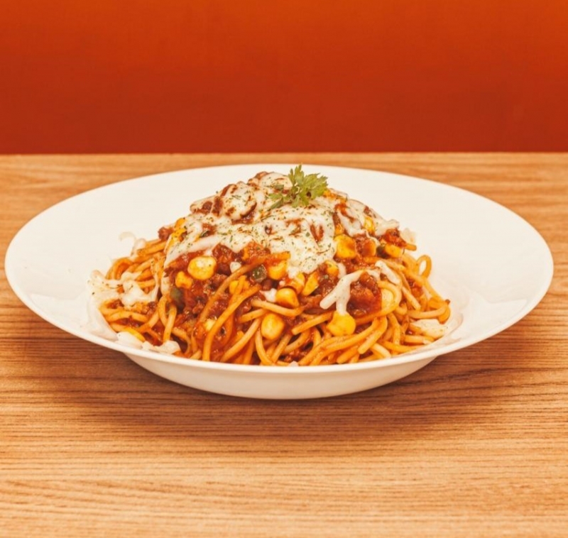 Macarrão espaguete, cebola, molho de tomate, milho, carne moída e muçarela.