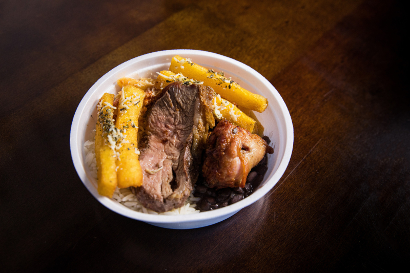 Servido na tradicional marmita de isopor (450g). Composto por arroz, feijão, massa do dia e carne do dia. Refeição completa, caseira e bem servida.