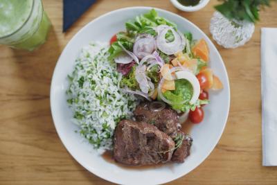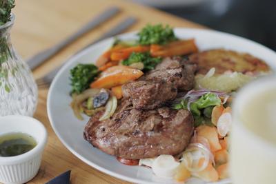Filé-mignon grelhado (200 gr), temperado com sal grosso e pimenta-do-reino, acompanhado de batata rosti, legumes na chapa (abobrinha, cenoura, brócolis, champignon e cebola ao shoyu) e salada da casa