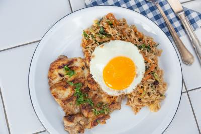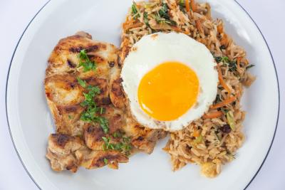 Coxa e sobrecoxa grelhada, arroz com legumes grelhados e molho yakisoba com um ovo frito por cima. Confort food versão Marvin.