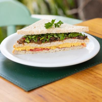 Pão brioche, ovo na chapa, queijo cheddar e cogumelos grelhados