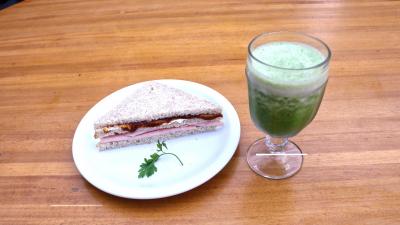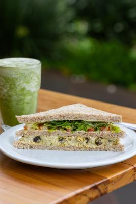 Frango desfiado com cream cheese, iogurte, nozes, salsão, passas, curry e gengibre; maionese, alface, rúcula, tomate fatiado ao azeite e tomilho.