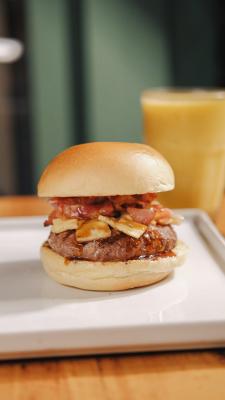 Burguer, manteiga de ervas, cheddar, bacon e cebola dourada