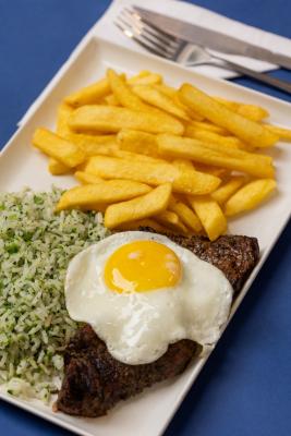 Filé-mignon grelhado (200 gr*), temperado com sal grosso e pimenta-do-reino, ovo, arroz com brócolis e batata frita ou salada da casa (radicchio, rúcula, cenoura, pepino, palmito, cebola-roxa e alfaces americana, crespa, roxa e frisada).