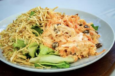Frango, cenoura ralada, maçã, uva passa, maionese, molho french e batata palha. Servida com alface americana.