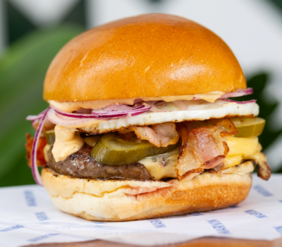Burguer, manteiga de ervas, queijo, bacon, ovo, picles, cebola roxa e maionese da casa