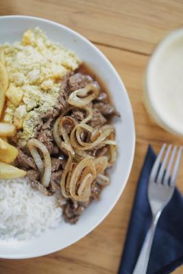 Picadinho de filé mignon (200g*) ao molho madeira, arroz, feijão refogado combacon, batata frita, cebola grelhada e farofa de ovo.