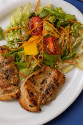 Coxa e sobrecoxa de frango temperadas com sal e pimenta-do-reino, acompanha salada da casa (radicchio, rúcula, cenoura, pepino, palmito, cebola-roxa e alfaces americana, crespa, roxa e frisada)