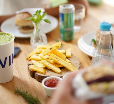 Pão brioche, Burger vegano (a base de feijão preto, beterraba, cebola, aveia e oleaginosas), pastad e grão de bico, picles, tomate, rúcula + acompanhamento + bebida.