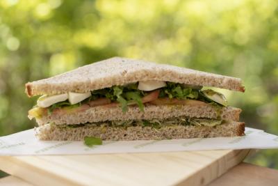 Salmão defumado (servido frio), cream cheese, alface, rúcula, tomate fatiado ao azeite e tomilho e maionese.