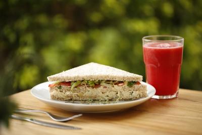 Atum temperado com cebolete e maionese, ovos cozidos, alface, rúcula, tomate fatiado ao azeite e tomilho e maionese.