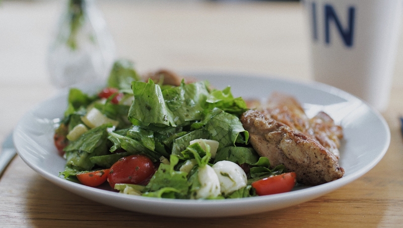 Coxa e sobrecoxa de frango temperadas com sal e pimenta-do-reino, acompanha salada da casa (radicchio, rúcula, cenoura, pepino, palmito, cebola-roxa e alfaces americana, crespa, roxa e frisada)
