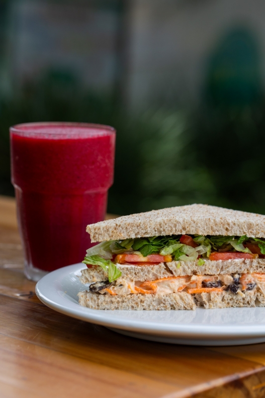 Salpicão da casa (frango temperado à moda da casa, passas, cenoura ralada, maçã, molho french e maionese), alface, rúcula picadinha e tomate fatiado azeite e tomilho.