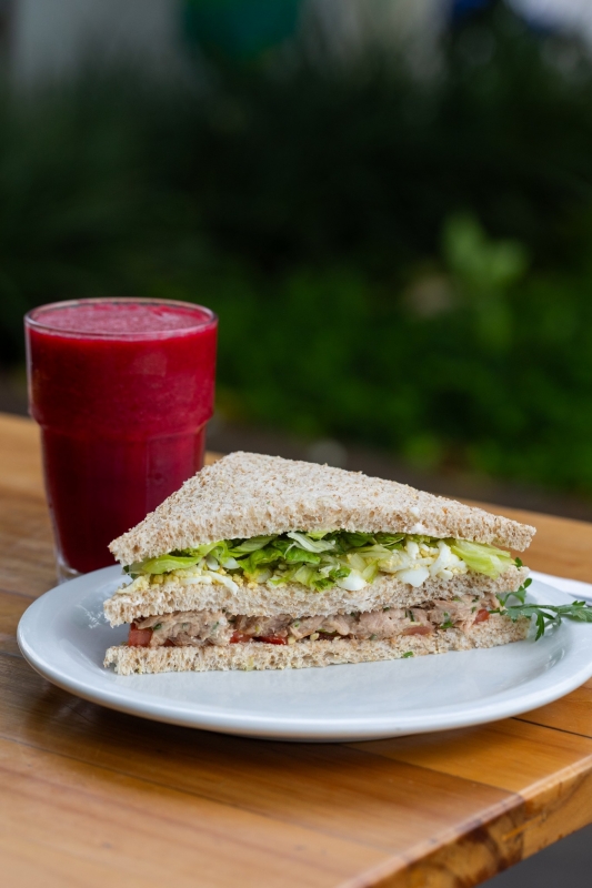 Atum temperado com cebolete e maionese, ovos cozidos, alface, rúcula, tomate fatiado ao azeite e tomilho e maionese.