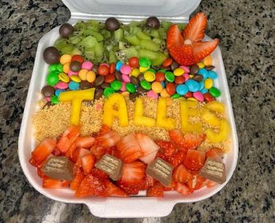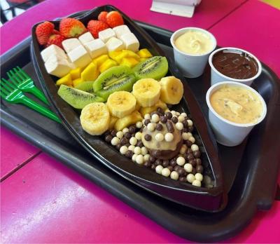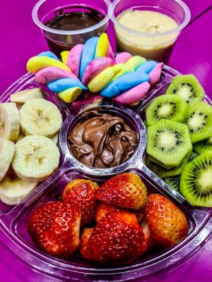 "Desfrute de uma experiência única com nosso irresistível fondue na roleta! Acompanhado de morangos frescos, bananas, uvas ou kiwi, Marshmallow e chocopawer e um delicioso creme D' cookies branco, todos os ingredientes são cuidadosamente cortados e separados para sua conveniência. Além disso, nossa exclusiva ganache de chocolate preto e branco é apresentada em porções individuais. Prepare-se para se deliciar com cada mergulho neste festival de sabores! Aproveite esta tentação hoje "