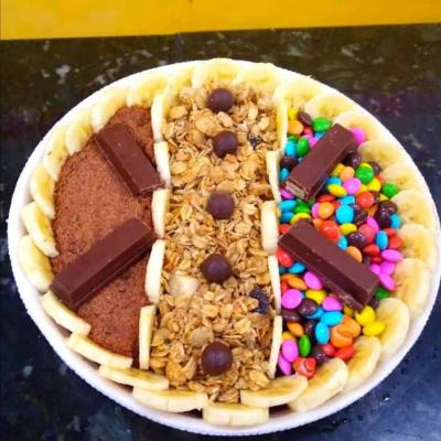 Sorvete Baunilha, Doce de Leite, Banana e Farinha Láctea.