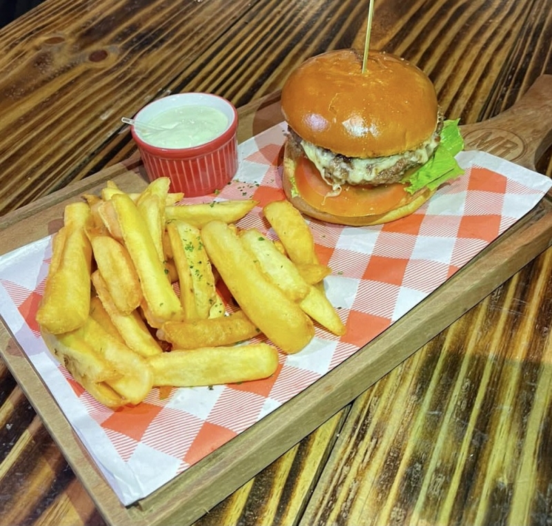 Blend de costela 150g, queijo mussarela, tomate, molho tasty e batata frita