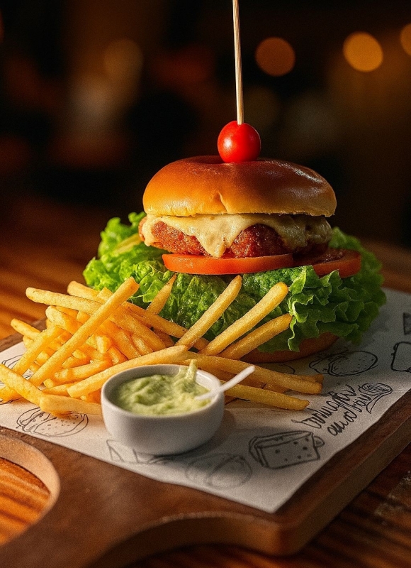 Hambúrguer de frango, queijo mussarela, alface americana, tomate, molho tasty e batata frita