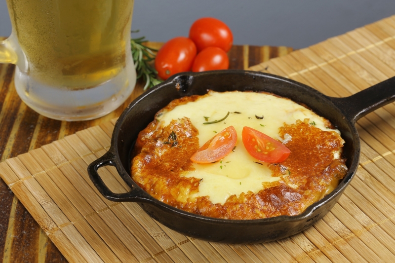 Provolone 200g, derretida na frigideira, acompanhada de tomate cereja confit.