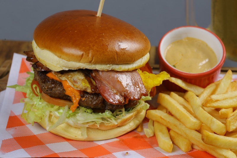 150g blend bovino, alface americana, tomate, bacon, cebola caramelizada, ovo, cheddar, acompanha batata frita.