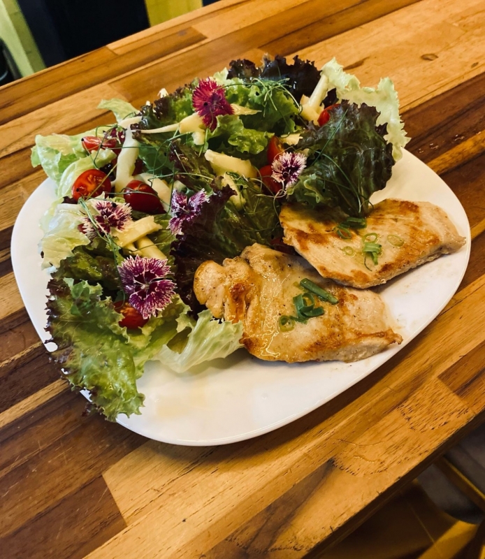 Mix de folha (alface americana, crespa e roxa e rúcula), tomate cereja, 120gr de frango em tiras e queijo parmesão.
