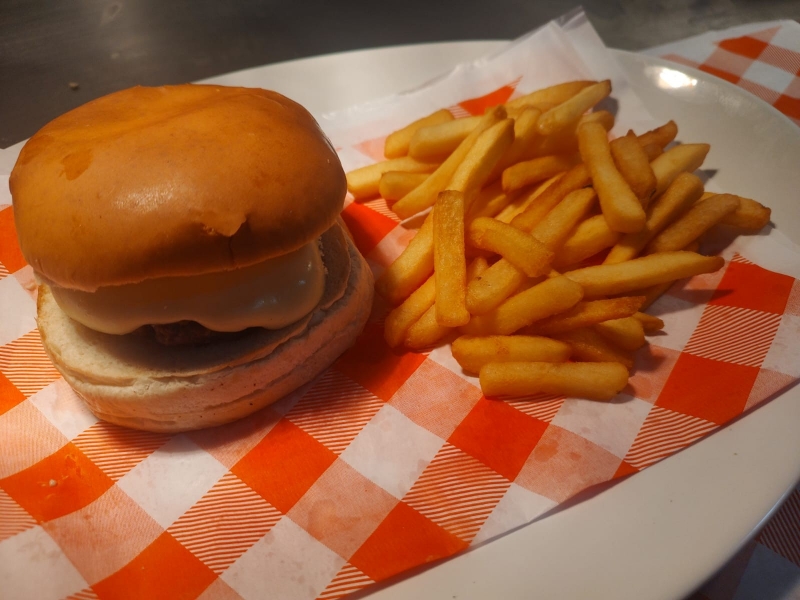 100g de hambúrguer, queijo, alface e tomate, acompanhado de 150g de batata frita.