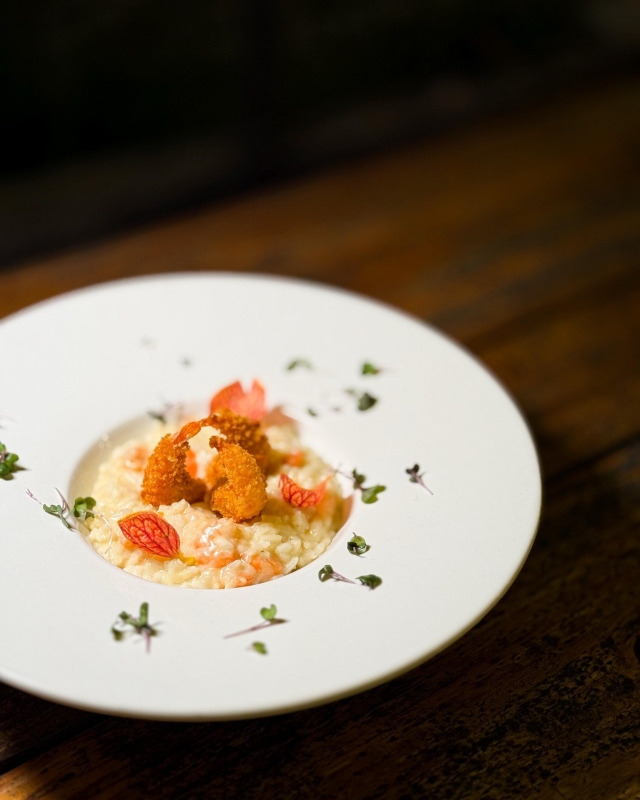 Camarões salteados na mateiga, arroz abório, calda de legumes natural, queijo mussarela e totem com camarão branco