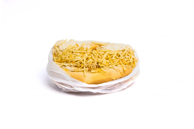 Pão de Hot-Dog, queijo mussarela, salsicha ao molho, milho e batata.