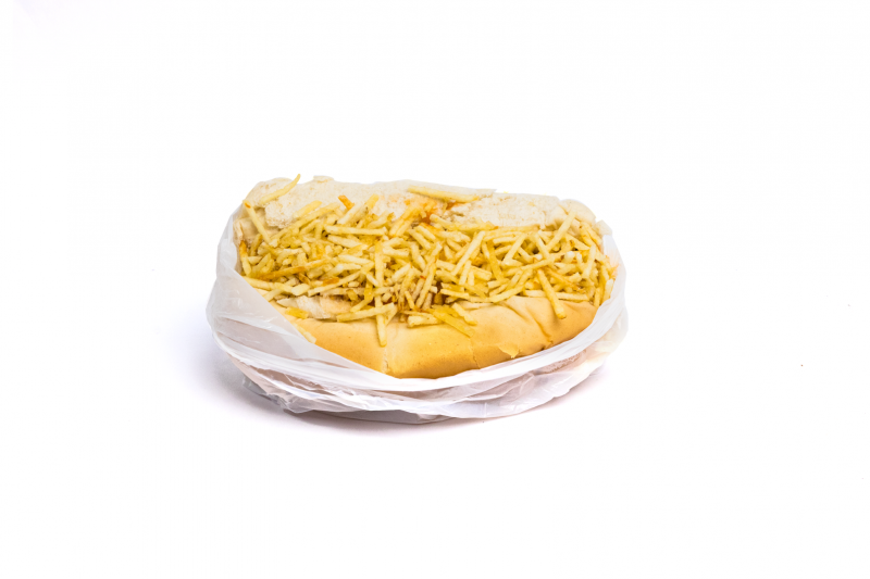 Pão de Hot-Dog, queijo mussarela, salsicha ao molho, milho e batata.