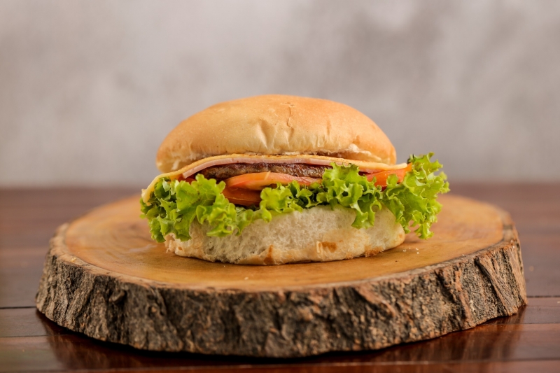 Pão bola, hamburguer, queijo, presunto, tomate, alface e molho especial